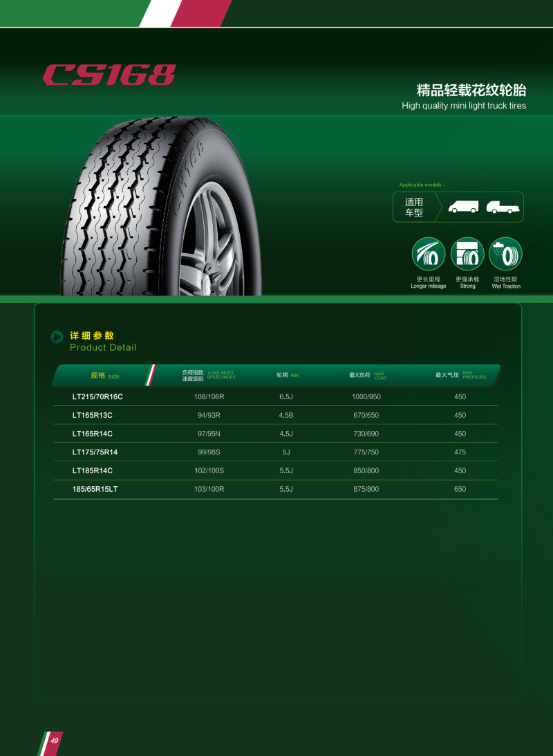 精品輕載花紋曲折的花紋溝槽加雙層胎體結(jié)構(gòu),更強的承載力,深花紋設(shè)計提供卓越的耐久性能。