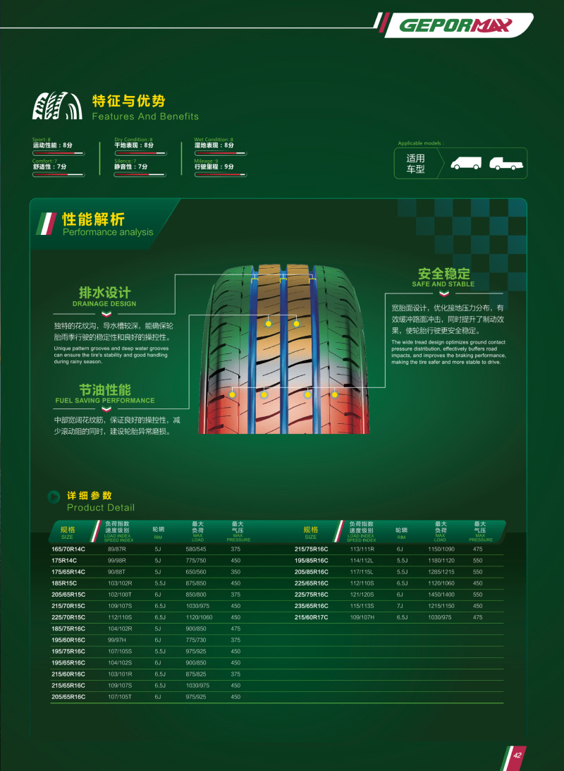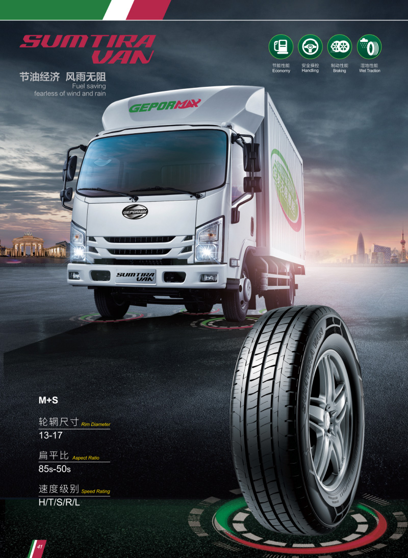 輕型商用車用輪胎,獨特的花紋溝,深排水槽,有較好的排水性和經(jīng)濟(jì)燃油性。