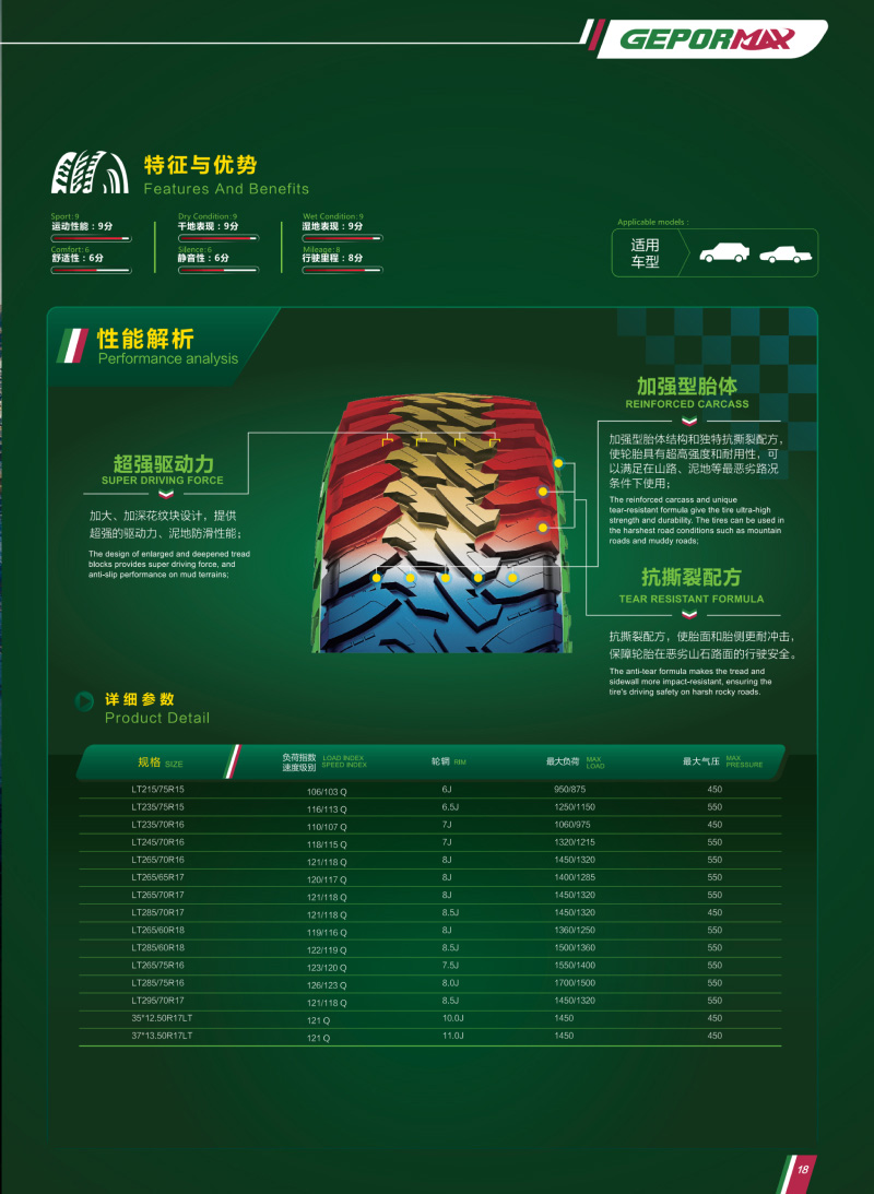 火焰型大塊花紋,是一款用于極限越野的輪胎,惡劣路況下提供超強的驅動力、泥地防滑性能。