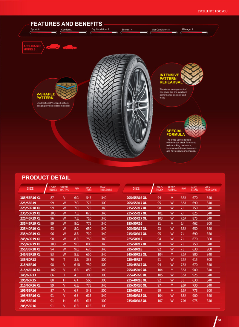高性能全季節(jié)輪胎,全新配方、單導(dǎo)向人字形花紋設(shè)計,操控性優(yōu)秀,雪泥地性能優(yōu)越,是一款綜合性極強(qiáng)的四季輪胎。