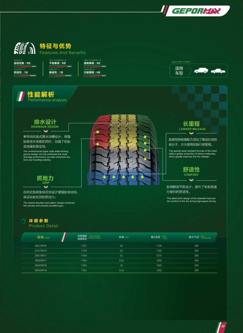 一款優(yōu)秀的全地形輪胎,突破性技術(shù)塑造胎面結(jié)構(gòu),對各自路況具有良好的適應(yīng)能力。